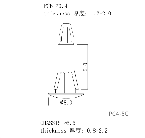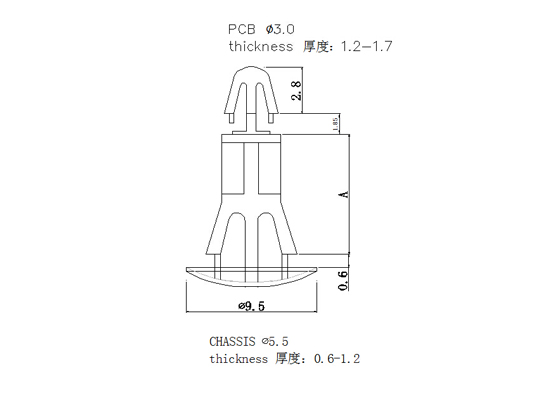 用途:一端固定機板上,另一端支撐PC板,避免下陷造成短路,PC板免鉆孔。